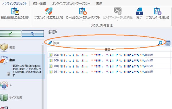 これを、memoQのファイル一覧画面の検索フィールドに入れて検索すると、これらのファイルのみがフィルタされた状態で表示されます(下記参照)。