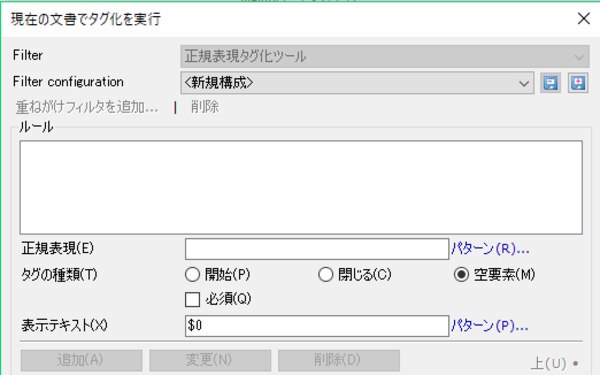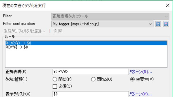 上記で確認したとおり正規表現を組み合わせ、 \<.*?/\> と \[.*?\] をそれぞれ[正規表現]フィールドに入力し、[追加]を押します。