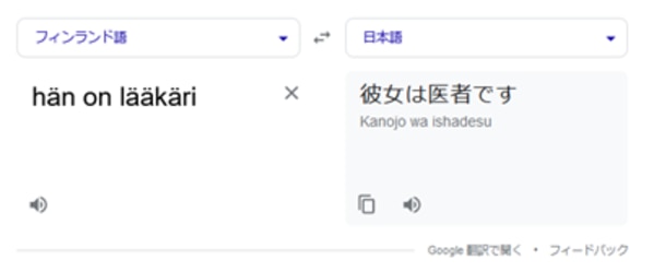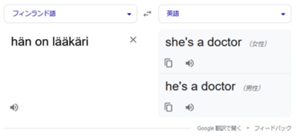 機械翻訳は基本的に原文に忠実に訳を出力しますが、上で紹介した記事の中では、フィンランド語で英語のHe/sheを指す「Hän」を使うとdoctorを男性とみなしてHeと訳されています。