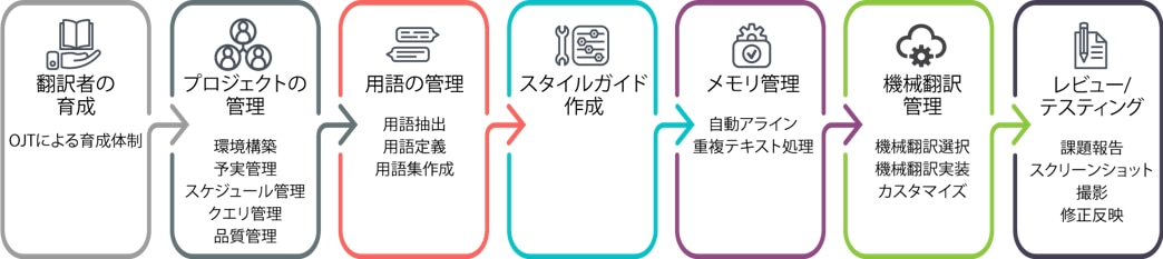 ただ単に翻訳を行うのではなく、長い目で見れば翻訳のプロセスというのは翻訳者を育てる段階から始まっています。また、翻訳をより効率的/効果的に行うための関連ツールや参照物などを作成/管理していく事も、本来であれば翻訳のプロセスの中に含めるべきものです。