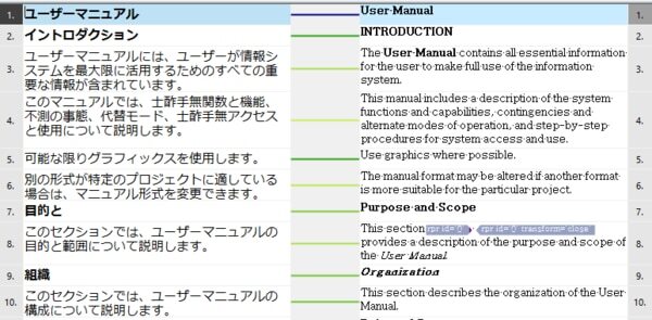 翻訳メモリは、原文と訳文を対にして登録することができるデータベースです。文書単位で原文、訳文が揃っていることは良いことですが、それだけでは翻訳メモリを構築するには不十分です。文書内の各文章が一対となる・・・つまり「Press “OK” = [OK] を押します」という形でデータベースに保存する必要があります。