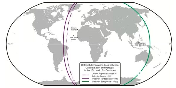 この紛争を収めるために、1494年にスペインとポルトガル間でトルデシリャス条約が締結されました。この条約の中では、両国の領土の範囲が定められており、境界線のあるカーボベルテ諸島から西へ約2000kmの領域がスペイン領、東側がポルトガル領と定められました。
