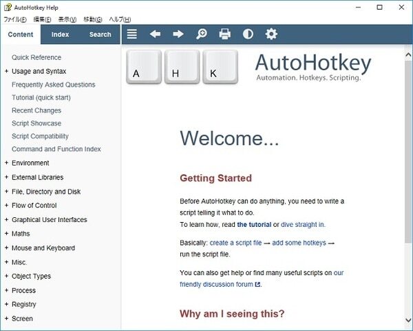 AutoHotKey の初期画面です。チュートリアルも充実しているので時間をかけて学べばかなりの作業が自動化できます。
