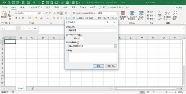 マクロ記録の初期画面です。ここでマクロの名称や保存場所を設定できます。個人用マクロブックに保存しておくと、バックアップを取ることができます。