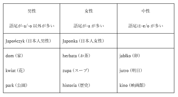 以下のように、名詞はすべてこの3つに分類されます。名詞の意味が生物の場合はその「性別」で分類が決まる場合もありますが、多くは「性別」には関係なく、語尾で名詞を分類します(下表参照)。「一体それがどうした」と思うかもしれませんが、ポーランド語ではこの性がとても大切な役割を担います。