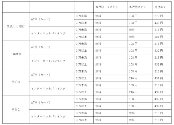 上記の表はキャッシュカードを使った場合なので、現金振り込みの場合は少し高くなります。