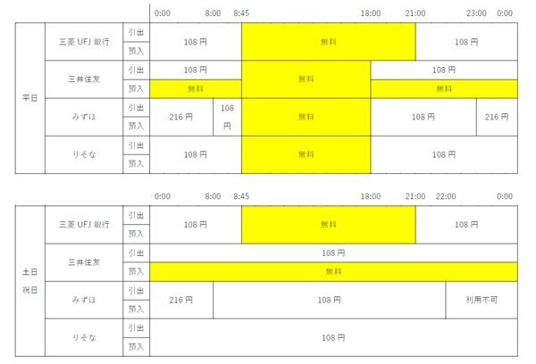 ATMは使う時間帯によって手数料を取られてしまうことはみなさんご存知かと思います。自分のお金を引き出す、もしくは預け入れるのになぜ手数料をとられなければいけないのか・・と納得できませんが、そうはいっても仕方ありません。できるだけ手数料がとられない時間帯にATMにいくしかありません。