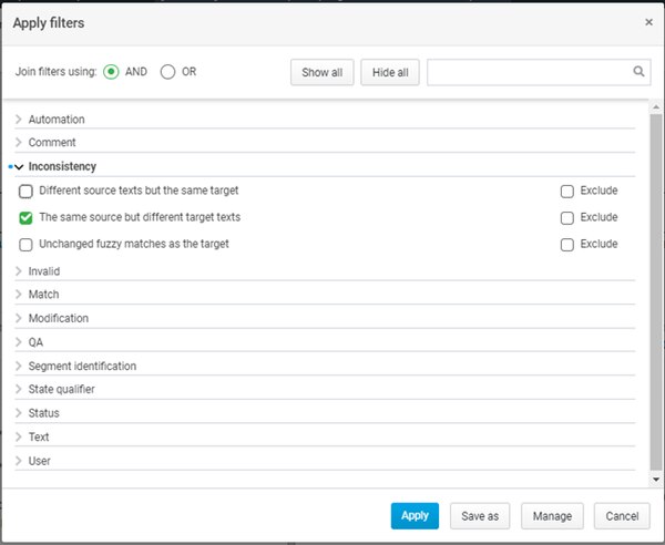 このフィルタを適用すると、同じ原文で訳が揺れているセグメントを検出できます。