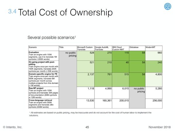 上記のSlideShareでは、運用費用を含めた総所有コスト(TCO)を基準に各エンジンを評価しています。特にGoogleのAutoMLやMicrosoftのCustom Translatorは、ベータ版/プレビュー版という扱いもあって、まだカスタマイズにどれだけの費用が掛かるのか実証していないケースが多く、下記のデータは大変貴重です。