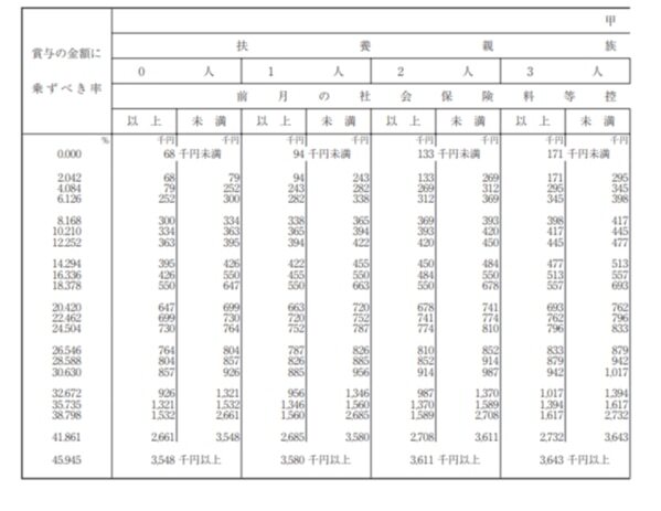 所得税率というのは国税庁が公開している「賞与に対する源泉徴収税額の算出率の表」に掲載されています。扶養人数によって率が変わるので、見方には注意が必要です。