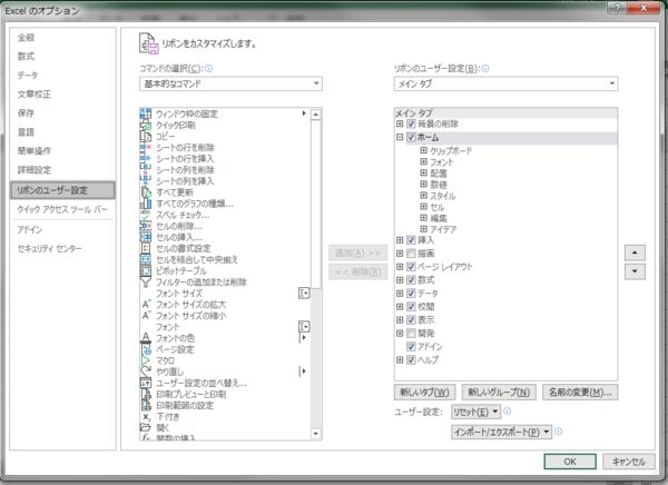 左側のボックスにはExcelのコマンド一覧、右側のボックスはリボンのタブの設定があります。右側に表示されている既存のタブに左側のコマンドを追加・削除したり、新しいタブやグループを作って、そこにコマンドを追加・削除していきます。「▲」「▼」ボタンで順番を入れ替えたり、誤って削除してしまった場合などは、「リセット」ボタンでリセットすることも可能です。