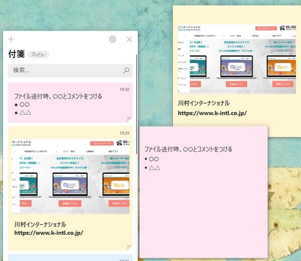 PCのデスクトップに付箋を貼っておけるので、デスクやディスプレイ周りが付箋だらけにならなくてすみますし、作業中に何度も目にするのでうっかり忘れてしまう、という事を防げます。不要になったメモはそのまま削除できるので、ペーパーレスでエコにもなりますね。