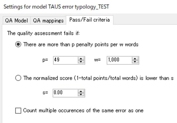 次に、Pass/Fail criteriaで合格基準を設定します。今回は、1000ワードに対して、50ペナルティポイント以上で不合格とします。OKを押して画面を閉じます。