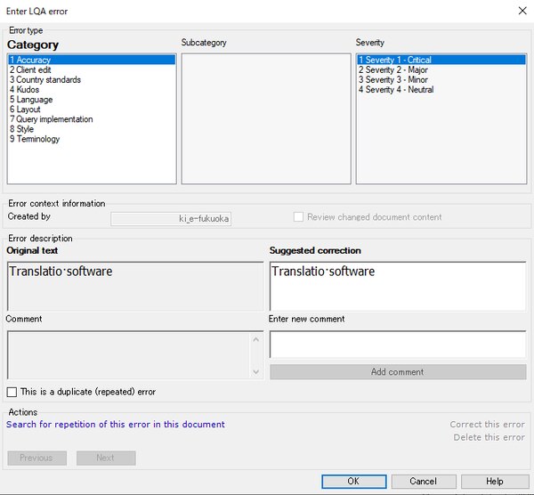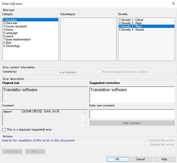 Categoryでエラーを選択し、Severityで重みづけを行います。修正案はSuggested correctionに入力します。コメントを付けたい場合は、Enter new commentに入力し、Add commentを押します。OKを押すとエラーがセグメントに記録されます。