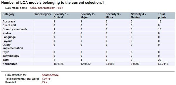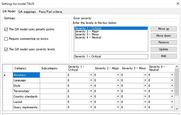 memoQにはレビューワーが翻訳者にフィードバックするための機能として、LQA(Linguistic Quality Assurance)機能があります。自ら設定を作ることも可能ですが、LISA、J2450、TAUSといった翻訳品質評価モデルに準拠した既存のLQA modelを使うこともできます。お好みのQAモデルを使って、エラーの記録やスコアリング等ができる便利な機能です。 |