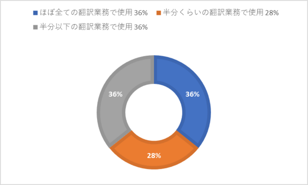 使用頻度については、ほぼ全ての翻訳で使用される方と半分以下の翻訳で使用される方が同率となり、半分程度の翻訳で使用される方がやや少ないという結果となりました。