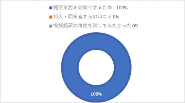 この質問には、すべての方が「翻訳業務を効率化するため」と回答されました。「知人・同業者からの口コミ」により導入された方や、機械翻訳の精度そのものを確認することをきっかけとした方はいませんでした。