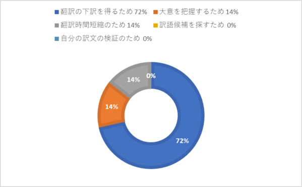 「翻訳の下訳を得るため」という回答が最も多く、次いで「大意を把握するため」「翻訳時間短縮のため」が同率となりました。機械翻訳の出力でざっくりと意味をつかみ、それを基に翻訳する、もしくは下訳を修正して訳文を完成させる、という形で活用されている方が多いようです。ご自身で翻訳をした後に、確認の意味で機械翻訳を使うという方はいらっしゃいませんでした。