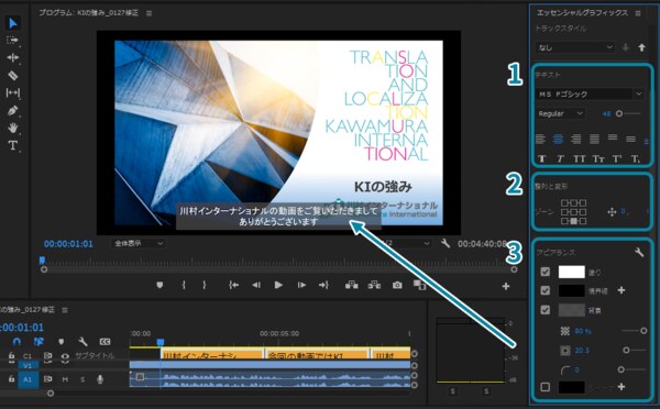 ⑥最後は動画に合わせて、字幕のフォント等、見た目を修正します。修正したいキャプションを「テキスト」パネルで選択して(全部ならCtrl + A)、「キャプション」ワークスペースの右側にある「エッセンシャルグラフィックス」パネルと、動画が確認できる「プログラム」パネルを使います。