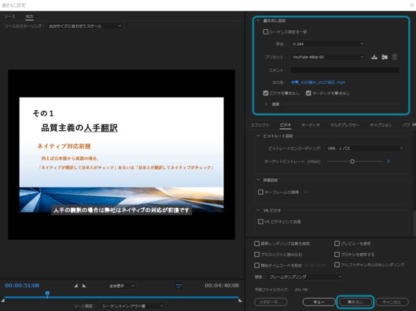 ④「書き出し」または「キュー」ボタンをクリックするとエンコーディングが始まります。「キュー」をクリックするとAdobe Media Encoderが開き、そこでさらに「キュー」パネルの緑の再生ボタン(➤)をクリックすると書き出しされます。Media Encoderを使うと、Adobe Premiere Proで引き続き作業できます。