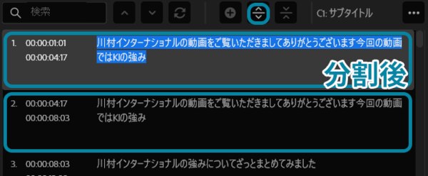 - 「キャプションを分割」:一緒に表示させたくない文章を分割させます。クリックすると同じキャプションが作成されるので、表示させたい形に修正します。