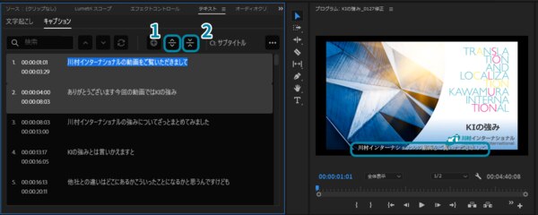 ⑤キャプションが作成され、「プログラム」パネルの動画でも字幕がついていることを確認できます。キャプションは日本語でもかなり良いタイミングで作成されますが、ここでも調整が必要です。文章も再修正しながら、キャプションを最適化していきます。