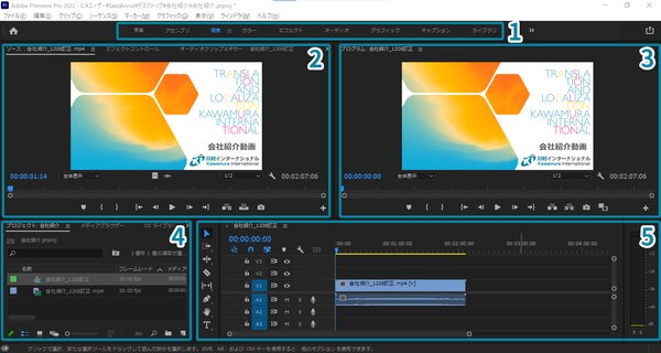 - ワークスペース:やりたいことに合わせて、ワークスペース(基本画面/画面のレイアウト)を変更および編集。今回使うのは「編集」と「キャプション」です。