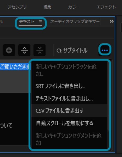 ⑦出来上がった字幕をSRTやテキストファイルとして使いたい場合は、「テキスト」パネルの「…」をクリックして、好きなフォーマットで書き出ししましょう。