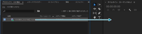 取り込んだ素材を「タイムライン」パネルにドラッグして、シーケンス(動画を作るためのデータ、素材が流れる順序)を作ります。