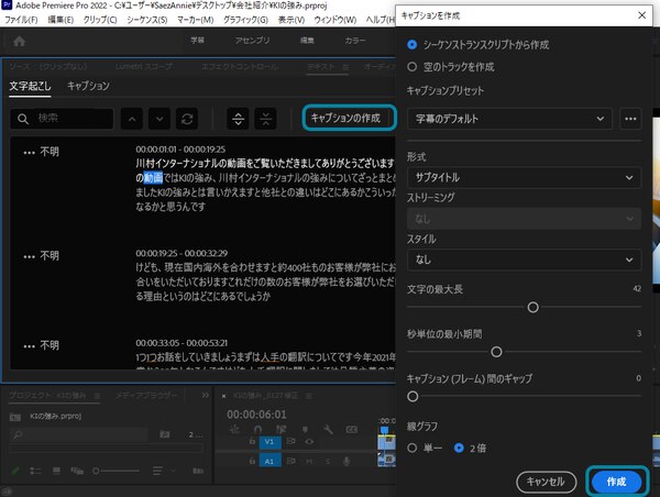 ④修正が終わったら、選択されている「文字起こし」パネルの「キャプションの作成」ボタンを押します。