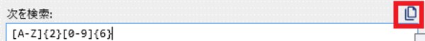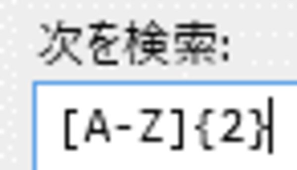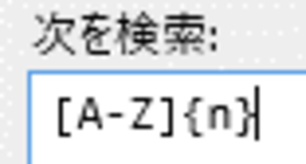 [次を検索:]フィールドに下記の通り正規表現が入力されるため、nの部分を”2”に置き換えると、「大文字アルファベット2文字」を表す正規表現ができました。