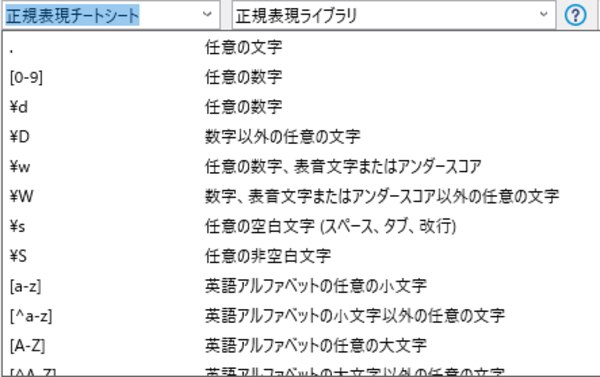 正規表現チートシートドロップダウンでは、特殊文字(正規表現)が意味とともに一覧になっていますので、正規表現の知識がない人でもこちらから特殊文字を選択して正規表現を作成できるようになっています。