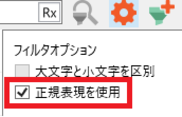 エディタ画面の歯車マークをクリックすると、フィルタリングオプションが表示されます。ここで[正規表現を使用]にチェックを入れます。