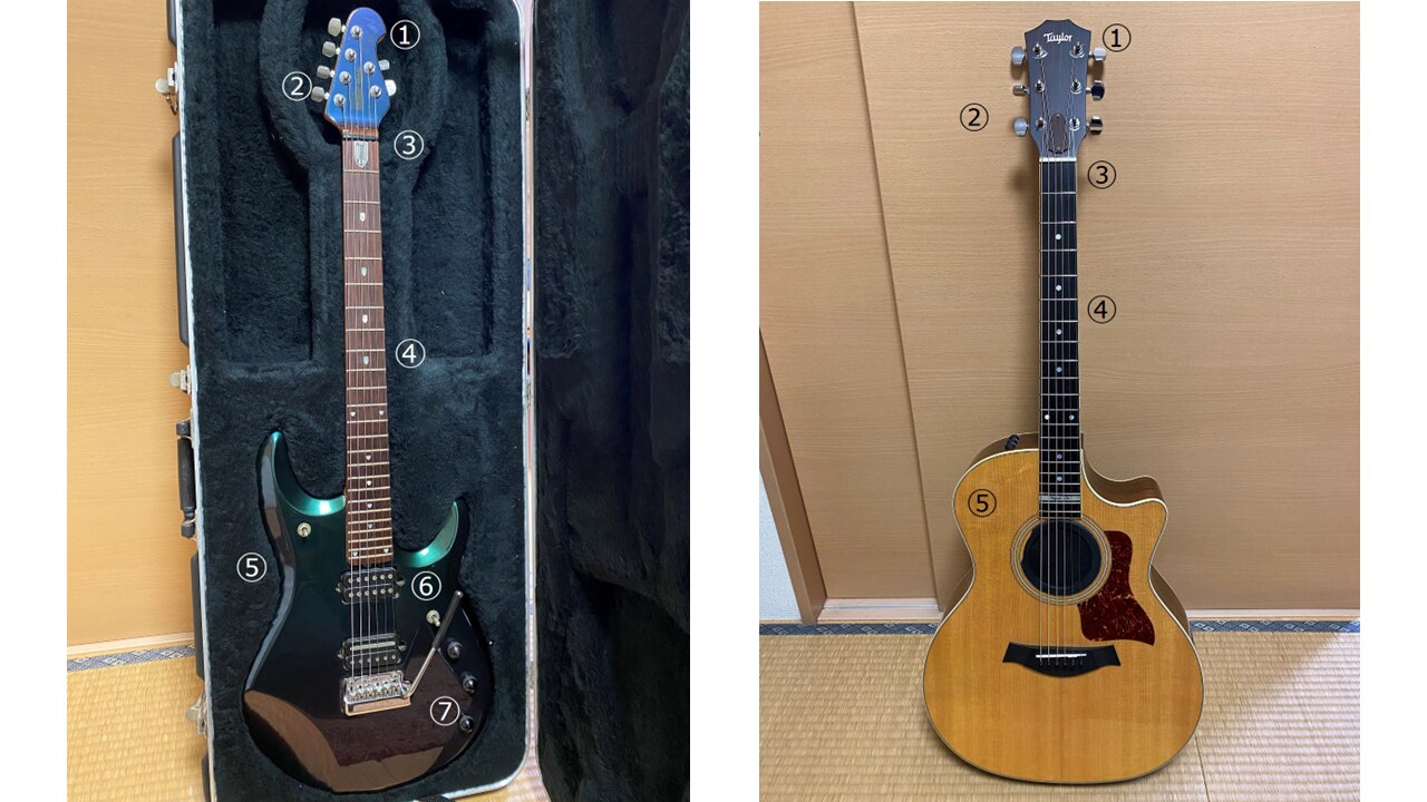 こちらは筆者が実際に所持しているギターになります。本記事で紹介しているパーツ がどの部分の名称のことなのか、①~⑦の番号で是非確認してみてください。