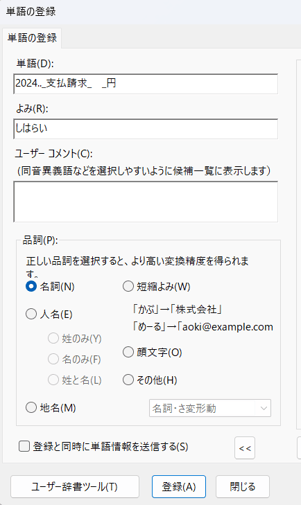 例として下記のように区別しやすいように“よみ”で登録しておきます。下記の画像の例では、「しはらい」と入力すると登録した基本フォーム「2024.._支払い請求 _円」が表示されるようになります。入力ミスも防ぐことができ、スピード化にも役立ちます。お得意先の社名も単語登録しておくとより便利です。