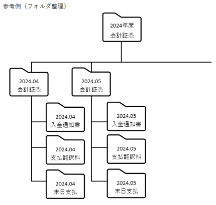 ほかにも会計監査など、証憑だけの提出を求められる場合も少なくありません。迅速に対応するためには普段より証憑のファイル名ルールを作り、整理しておく必要があります。