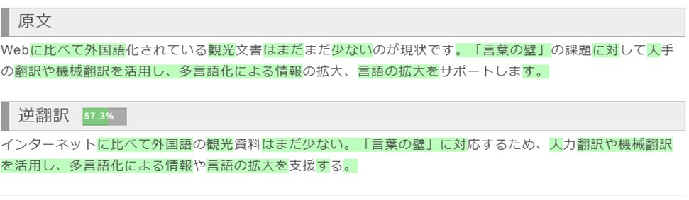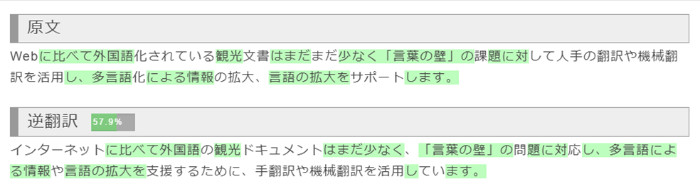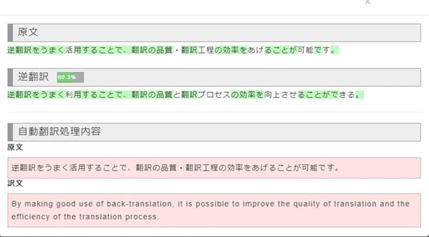 原文と逆翻訳の文を見るとほぼ同じ意味になっています。日本語から翻訳した英文を原文として再度日本語に翻訳しなおしていますので、この2つの日本語文の意味が一致していれば、最初の英語の翻訳結果の質が良いということが確認できます。