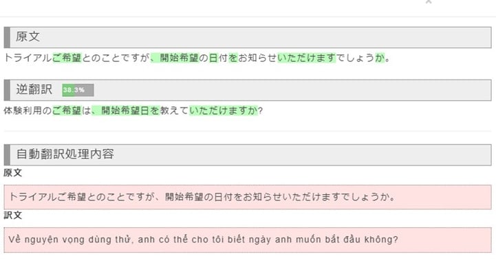 逆翻訳した日本語文を原文と比較すると、逆翻訳後の日本語は少しぎこちなくは感じられますが、「トライアル(体験利用)の開始を希望する日付を教えてほしい」という要旨は一致しています。そのため、翻訳したベトナム語の文で主旨は伝わりそうだということがわかります。
