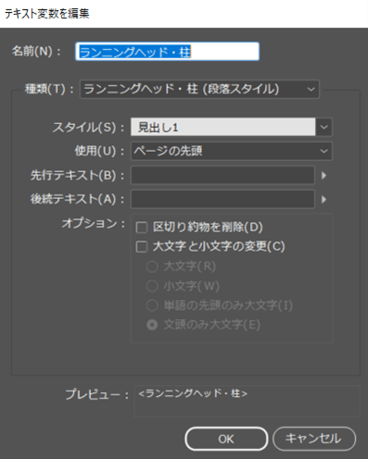 まずは「書式(T)」 > 「テキスト変数(V)」 > 「変数を管理(O)」にアクセスします。デフォルトが既にいくつかありますが、今回は「ランニングヘッド・柱」を使用します。「編集(E)」で開けると、下記画面を確認できます。