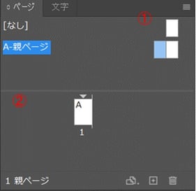 親ページ(①)か本文(②)のどちらかを直接編集したい場合はページパネルで左クリックするか、InDesignの下部にあるドロップダウンメニューで移動したいページを選択します。親ページの追加や管理をするには、①の親ページやその窓内を直接右クリックしたり、または右上にある横線4つのアイコン、右下にあるアイコンを押したりします。