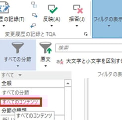 エディタ画面の「レビュー」タブには、フィルタ機能があります。さまざまな観点で分節をフィルタでき、用語の検索もできるので非常に便利なのですが、中でも知っておくと重宝するのが、「すべてのコンテンツ」項目です。