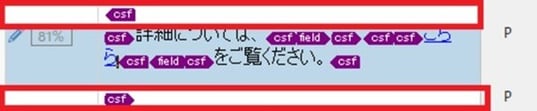 たとえば、下記の赤枠で示した個所が、「すべてのコンテンツ」フィルタでのみ表示される、翻訳対象外の個所です。分節内には取り込まれていないタグが存在していることがわかります。