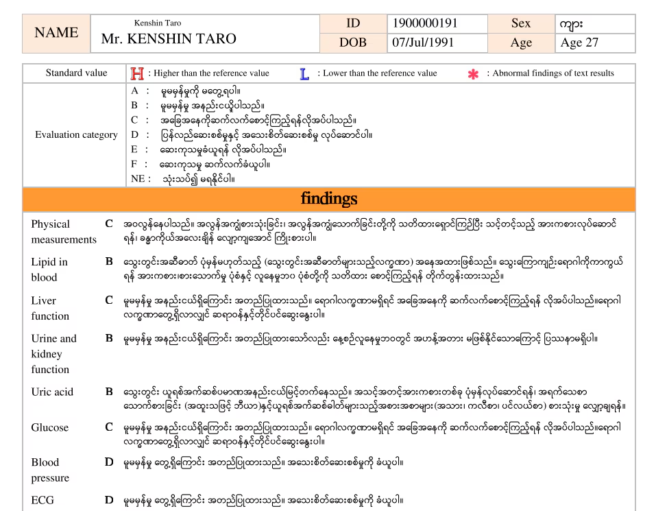 健康診断の受診報告書サンプル(ビルマ語出力の例)