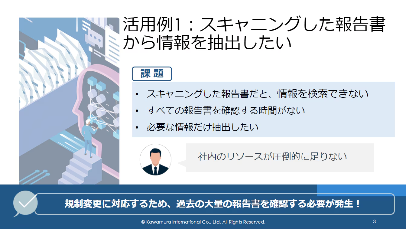 翻訳費用の削減や、翻訳の質の向上につながるデータを作成する、AI・アノテーションサービスの「問合せ対応を効率化」「スキャニングした報告書から情報を自動で抽出」「用語集の作成」など、具体的な活用例をまとめた資料です。