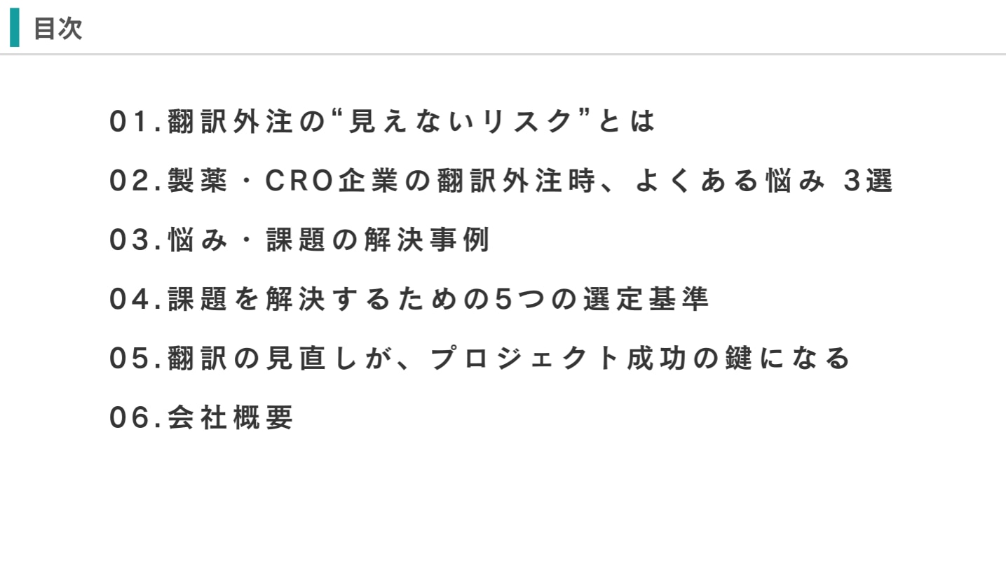 ・翻訳外注の“見えないリスク”とは ・製薬・CRO企業の翻訳外注、よくある悩み 3選 ・悩み・課題の解決事例 ・課題を解決するための5つの選定基準 ・翻訳の見直しが、プロジェクト成功の鍵になる